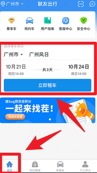 2、快速租车:在首页选择用车城市和时间区间后,点击"立即租车"即可完成订单;