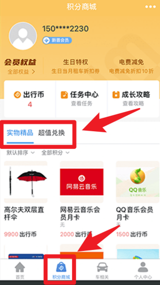 3、积分兑换:通过底部导航进入积分商城,可用出行积分兑换实物礼品或会员权益;