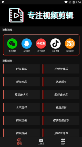 1、剪辑界面提供视频净化、素材创作等核心功能入口;