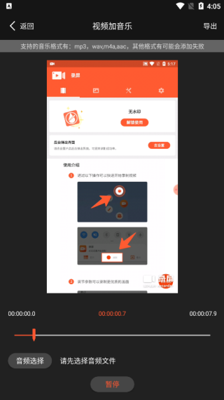 3、配乐添加功能允许用户从相册选取视频后,自由匹配本地音频文件并导出成品;