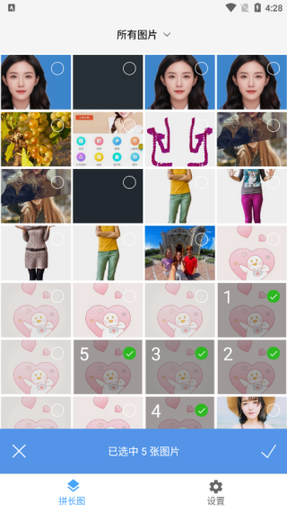 2、勾选需要拼接的图片后点击确认按钮完成选择;