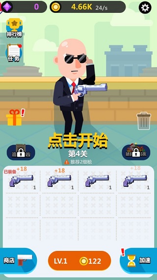 除上述外的基本闯关玩法外,这款游戏还有休闲的合成要素,对于合成休闲游戏已经成为了当下休闲市场不可或缺的重要因素之一,在游戏的主界面中,玩家可通过购买枪支,并将相同两个等级类型相同的枪支进行合成,由此将提升枪支等级,对于后续关卡的难度挑战,有着非常重要的作用。