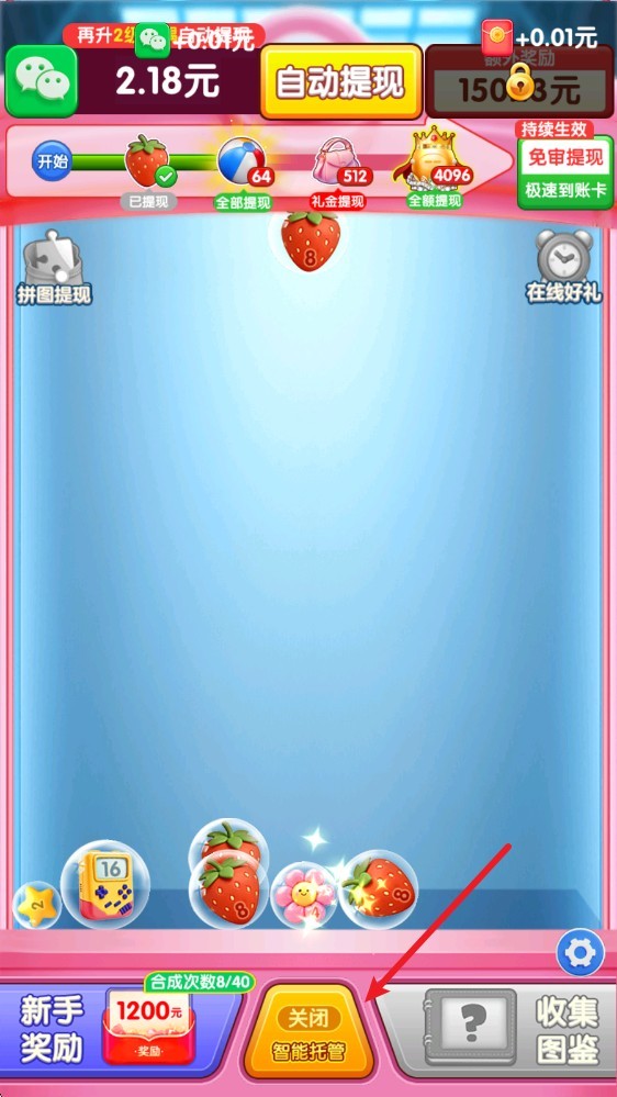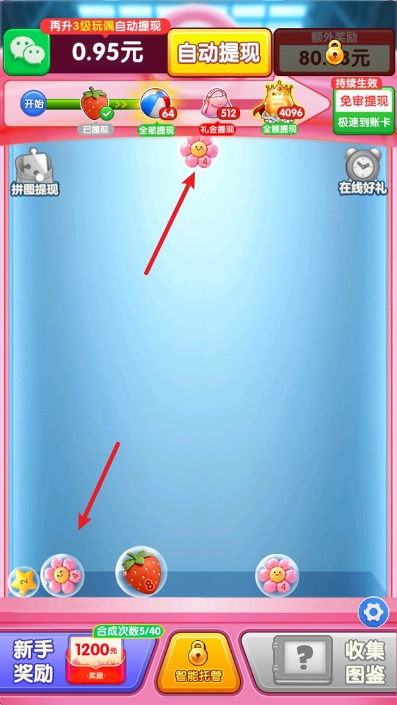 3、合成出4级玩偶之后,我们还将会解锁智能托管功能,可以帮助你自动合成。