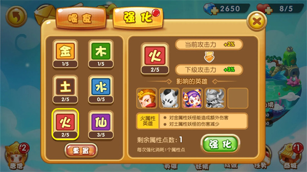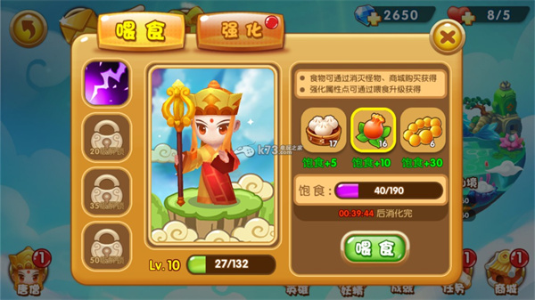 挑战过程中通过喂唐僧食物能不断的增加唐僧的属性,而且需要注意的是这部作品中每个人物都拥有对应的属性,你能前往强化界面强化自己英雄的属性,而且蟠桃还可以通过打怪获得,在关卡中你要在有蟠桃的情况下释放强力的必杀技。