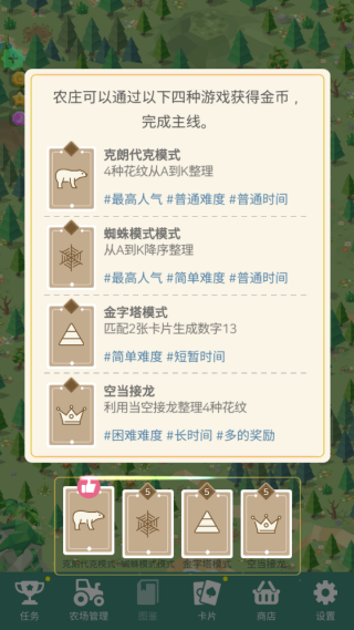 3.通过游玩各种类型的纸牌游戏来获取金币,然后使用金币解锁农庄的更多区域。