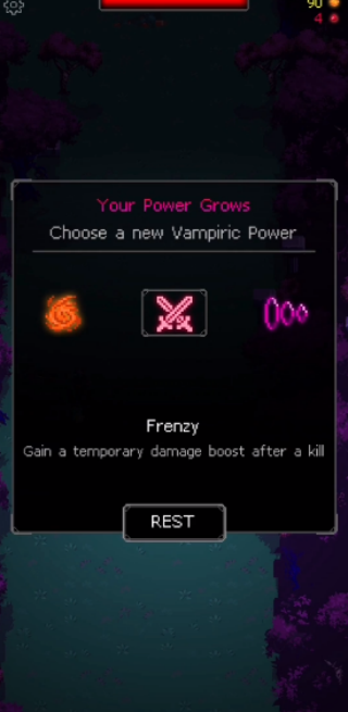 2、力量成长时,选择 “Frenzy”(狂热)能力,击杀敌人后能获得临时伤害提升,有助于快速清敌和推进战斗,提升作战效率。
