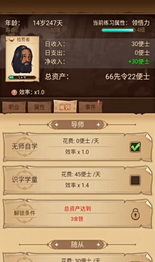 1、积累资产,待总资产达到3金镑后解锁更高效率的 “识字学童” 导师选项,前期通过 “无师自学” 保证收支平衡,同时提升领悟力属性。
