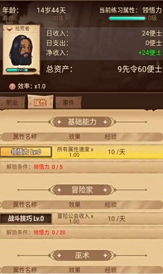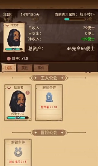 2、专注提升 “战斗技巧” 属性,完成拾荒者职业的解锁条件,逐步解锁冒险公会,通过职业升级和属性成长增加日收入,扩大总资产规模。