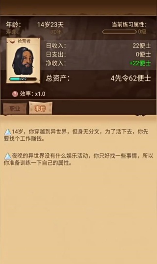 4、开局优先完成工作赚钱的事件,保证日收入为正,同时利用夜晚时间训练属性,重点提升领悟力和战斗技巧,为解锁更高等级职业和属性系统做好准备。