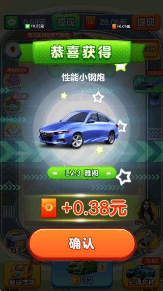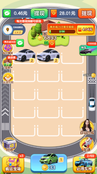 1.点击画面下方汽车按钮,玩家可消耗金币购买汽车,将相同汽车拖动合成,解锁新汽车。