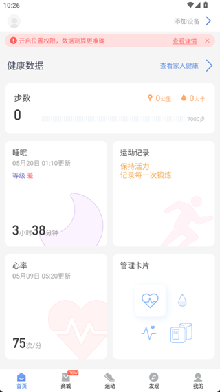 2、打开APP进入首页,查看步数、睡眠、心率等健康数据,了解自身健康状态。