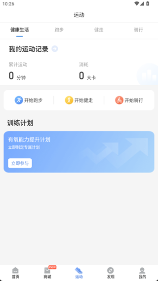 3、点击运动,选跑步、健走、骑行等类型,点开始按钮,记录运动过程与消耗。
