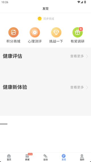 4、进入发现,参与积分商城、心理测评等,或浏览健康评估、新体验内容,拓展健康玩法。