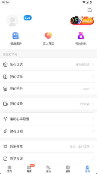 5、在我的,查看健康报告、家人互联、钱包等,管理设备、订单、积分,设置运动心率。