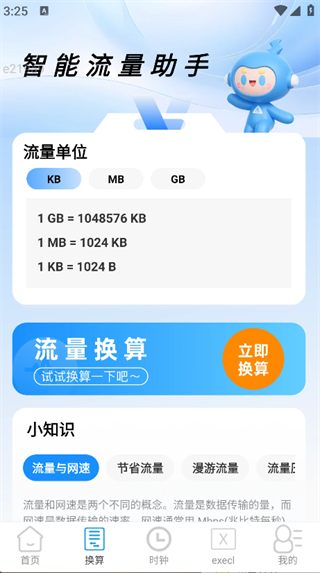 3. 点击页面下方的‘换算’图标,即可看到流量单位间的换算功能,还可以看到流量相关的小知识;