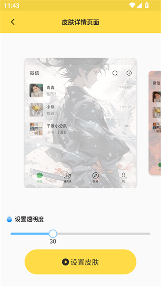 4、点击皮肤可以查看详情,还能调整透明度,最后点击下方设置皮肤即可。