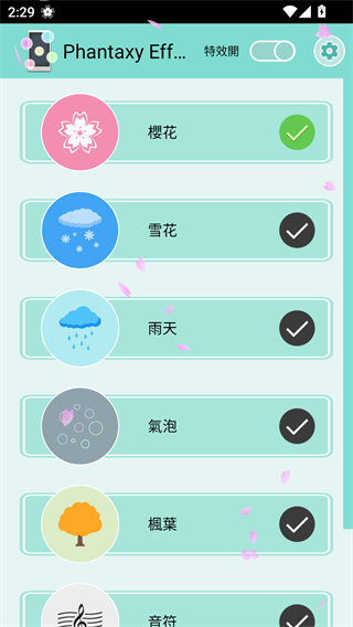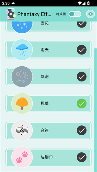 4、花、樱花、枫叶、气泡、猫爪、音符、泡泡等特效都可以免费设置;