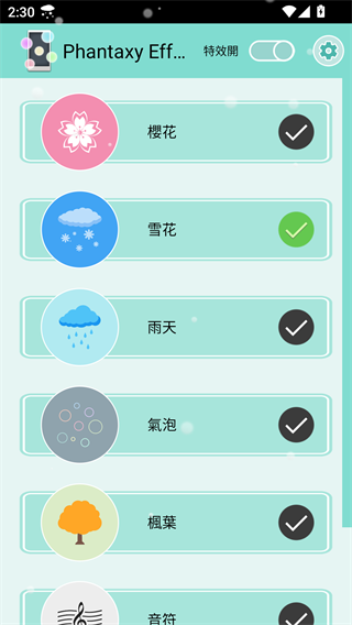phantaxyeffect 是一款超棒的手机桌面美化应用哦!它能给你的手机桌面带来超多炫酷特效。像模拟各种天气,还有树叶、花瓣飘落的效果都有呢!从此告别单调桌面,能按喜好设置,打造专属个性化桌面。不同效果对应不同心情,选个喜欢的,旧手机也能瞬间变新,打开桌面就能看到美美的特效。这里美化效果超多,枫叶、气泡、樱花啥的,一键设置轻松搞定,还能添加唯美风格,不占太多内存,感兴趣就快来下载呀!