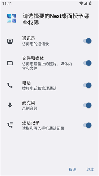 1、下载安装好软件之后打开,提示需要获取设备的一些权限,点击继续;