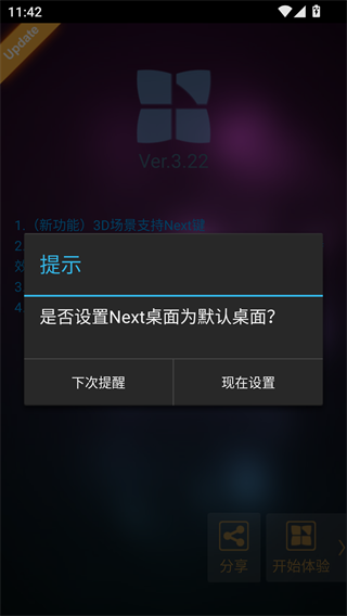 2、首次使用会提示是否设置为默认桌面,可以选择现在设置或者下次提醒;