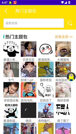 4、点击进入即可看到各类表情包,在上方搜索框里还可以搜索查找表情包。