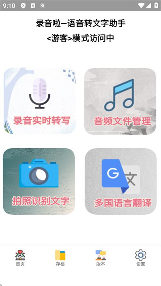 2、登录成功后,主界面主要提供四大功能:录音实时转写、音频文件管理、拍照识别文字以及多国语言互译。