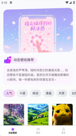 1、在动态壁纸中有人气、卡通、萌宠、漫画、风景以及创意等类别的壁纸;