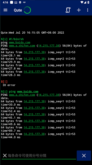 qute命令行shell是一款能在安卓设备上运行的终端模拟器app。有了它,用户就能轻松进入安卓内置的linux命令行界面啦。像ping、netstat、cd、mkdir这些常见的pc命令,都能在这里执行,从而让手机实现各种运行命令的操作,而且它还支持linux系统的命令在手机上模拟运行哦。