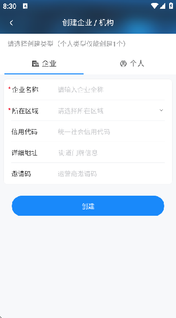 4、创建企业需要你提供详细的资料才能够注册成功。
