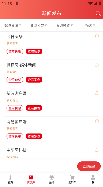 1、进入“资源库”,按媒体类型(新闻网站、自媒体、行业垂直平台)、粉丝量、报价等条件筛选。