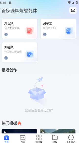 2. 在主页面即可看到最近创作、热门模版等功能;