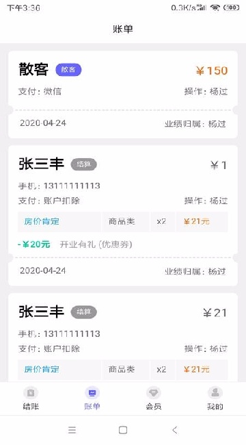 成功收款的账单都回保存,查看账单了解客户的消费内容;