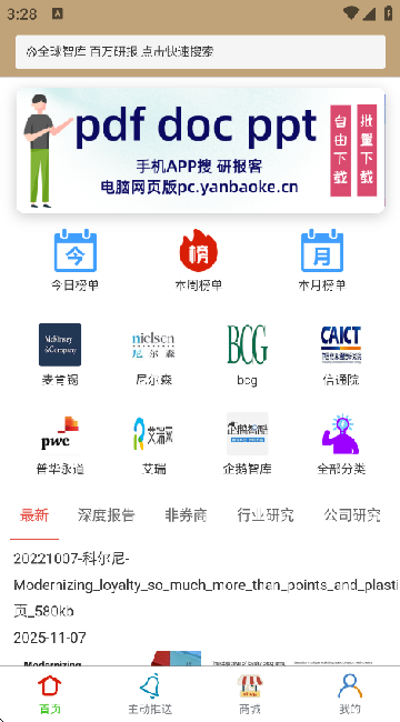 研报客app是个超棒的免费看研报平台,专注研究报告数据查看。能帮你在各类研究里发掘机会,全球数据任你查。它支持网页浏览,能下载电脑软件,微信小程序也能用,多场景满足你随时随地读行业分析报告。一站式提供全球各行业研报服务,阅读、下载等功能全,报告超丰富,还能全文搜索、实时推送,贴心至极。