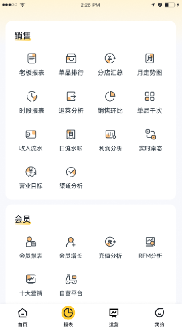 6、所有报表集合,涵盖了营运报表、会员报表、外卖分析报表;