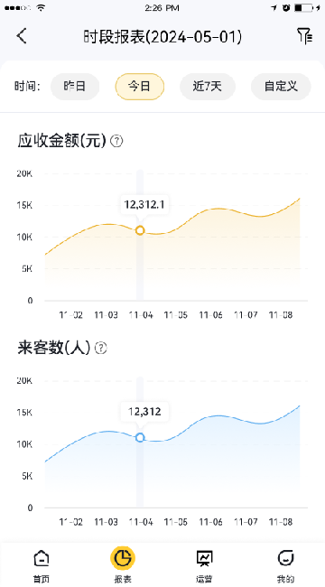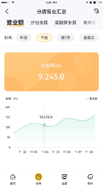 1、在首页或老板报表中查看门店的实时营业额,包括不同日期的营业额对比。