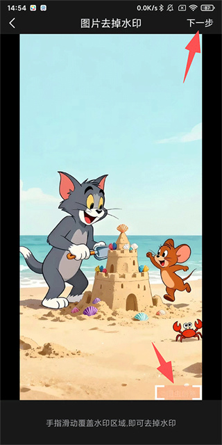 3、导入图片后用手指涂抹覆盖水印区域,实时预览效果后点击下一步。
