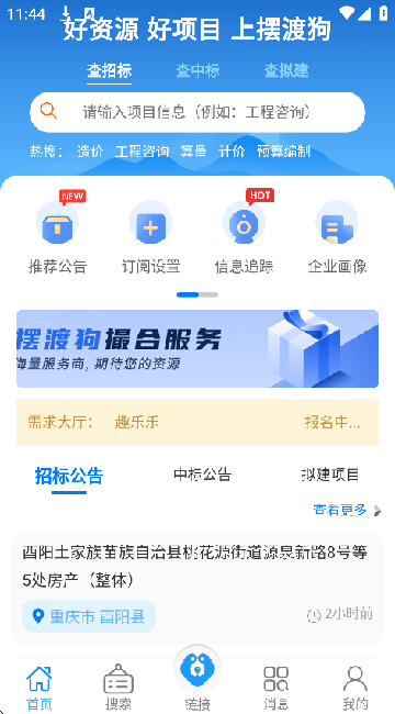 摆渡狗信息平台app是工程建设行业专属信息服务平台。只要是帮助这个行业的人找到项目资源,就可以随时在线查询项目。国家工程建设项目都可以在这里找到。项目详情一目了然,随时关注项目最新动态。除了查询项目外,您还可以在这里继续查询公司、人员、资质。该信息服务APP集多种功能于一体,可实时跟踪。只要登录,即可实时跟踪项目动态信息。招标和出价也可以在这里找到。投标、中标情况一目了然。更直观的是,连在建的项目都可以在这里找到。有项目需求的朋友赶紧下载这款应用吧。
