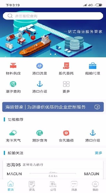 海运管家app是一款移动发货软件,主要服务于石油、化工等行业。提供更好的海运服务,能够帮助用户运输更加高效、安全、快捷,简单便捷。应用基于云计算和航运大数据技术,为用户提供更精准的服务,让您更高效地了解航运信息。在应用中您还可以实时了解海洋天气、潮汐查询、台风路径查询、港口信息等信息,让您的航运更加安全放心。可以及时更新并推送最新的货运信息给用户,让用户详细了解,更方便地掌握货运信息。在海运管家手机版中,您还可以了解公司及船代委托信息,让您的运输更加高效。