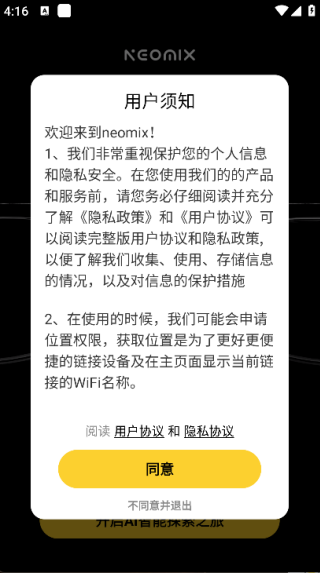 1. 下载并安装app,点击‘同意’,便可进入下一页面;