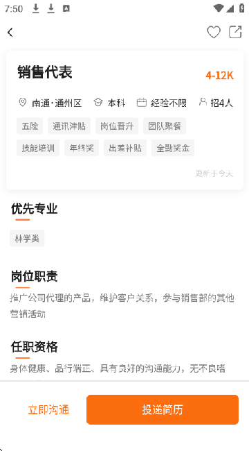 3、一键申请通道:看中岗位后可立即在线完善简历并提交申请;