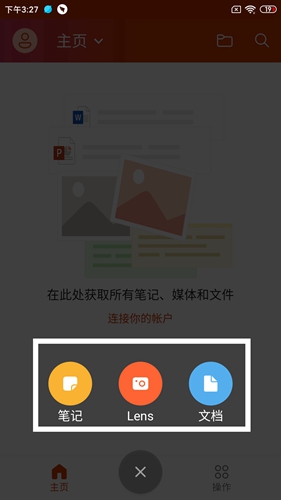 点击底部【+】按钮展开功能菜单,包含笔记记录、lens拍照识别、文档创建三大入口,其中文档模块集成word/excel/ppt核心功能。