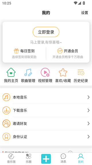 3、在我的个人中心板块,可以看到本地音乐、下载音乐等入口,登录后还可以签到;