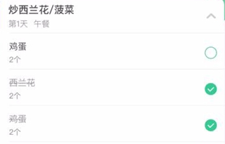 2、按日选择餐食,像黑咖啡、炒西蓝花等,标记已吃食物,记录饮食情况。