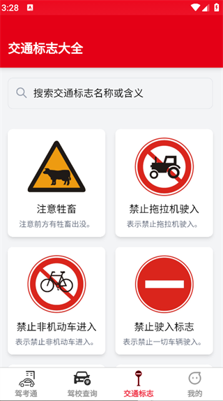 4. 点击页面下方的‘交通标志’,即可看到各类交通标志,还可以搜索交通标志名称或含义,找到特点标志。