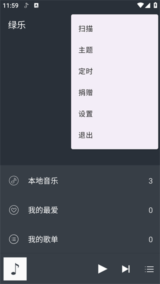 4、点击右上角三个点,可以扫描设备内的音乐资源,也可以设置主题颜色等。