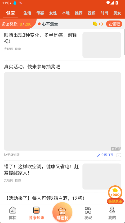 2、切换到 “健康知识” 页,阅读健康类文章,参与活动,还能领取阅读奖励。