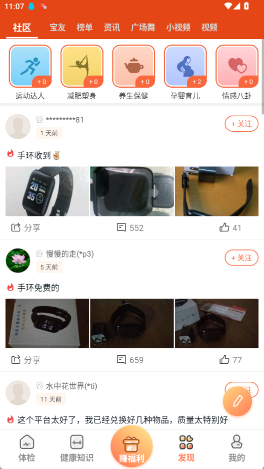 3、进入 “发现” 页,浏览社区各类话题,如运动达人、养生保健等,和宝友互动。
