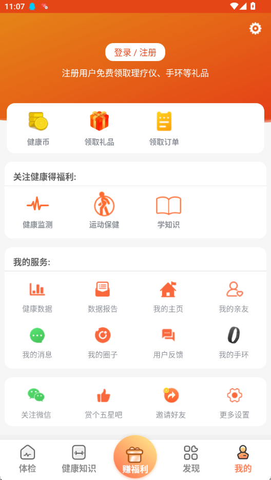 4、点击 “我的”,可登录注册领礼品,查看健康数据、我的消息等服务内容。