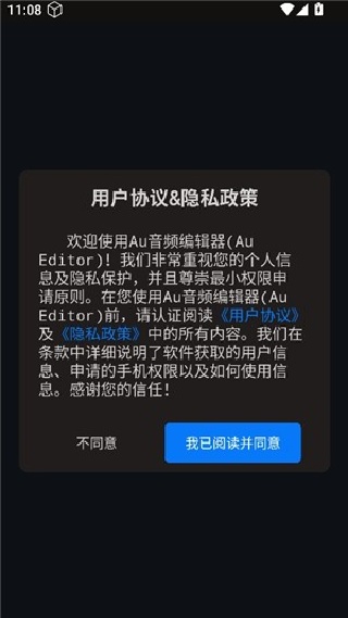 1. 在本页面下载Au音频编辑器,打开后首先同意隐私政策。