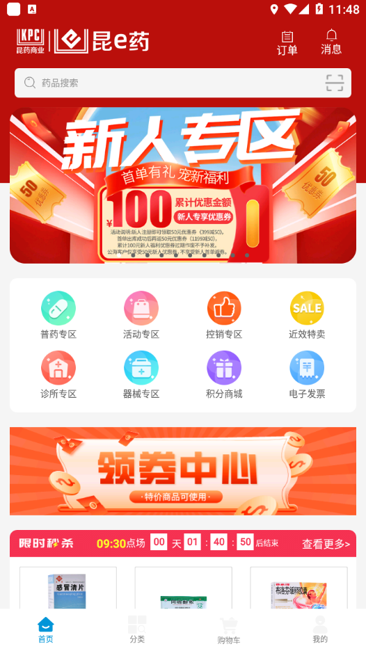 3、登录后,在首页可搜索药品,查看新人专区、领券中心等,参与限时秒杀。